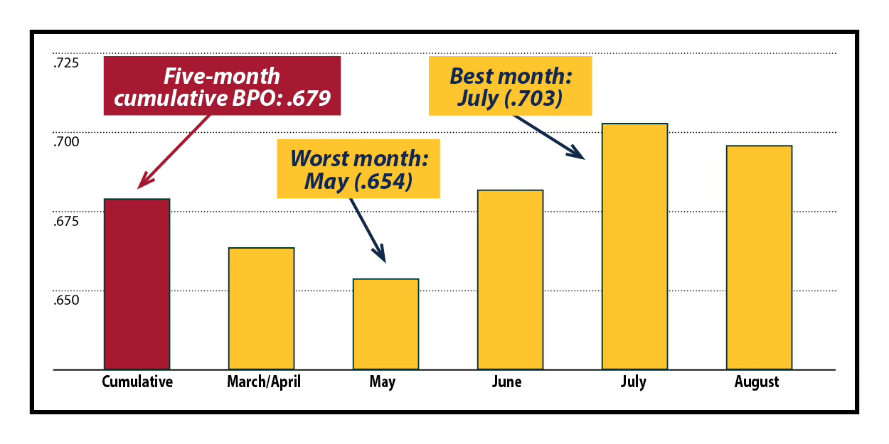 The subsequent upswing was largely fueled by a hot July, when big-league batters posted a monthly BPO of .703. This week’s graph offers a breakdown of the separate ratios for each month, beginning with the cumulative BPO in red: